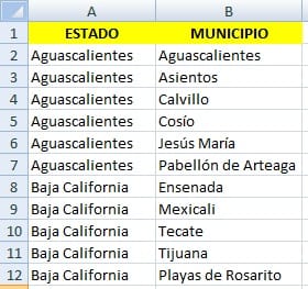 Si el valor de 'Entidad' = "Aguascalientes" las opciones de 'Localidad' deberían ser las celdas entre M9:M11. Si la primera opción fuera "Baja California", el rango de celdas a elegir sería de M12:M19, y así dependiendo de cada estado y la cantidad de municipios que tenga.