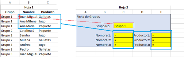 Tengo dos hojas en un excel de las cuales en la Hoja 1 tengo los datos de varios compañeros que forman grupos de 3 personas y x productos asignados (A2 = Número de grupo "se repite valor para cada integrante de grupo", B2 = Nombre, B3 = Producto Y necesito llenar en la Hoja 2 una ficha en donde si elijo o escribo el número del grupo este me traiga en los campos inferiores los datos de mis compañeros y el producto asociado sin importar el orden de la columna A2 (Grupo). Adjunto Imágenes explicativas para poder tener una ayuda. Gracias
