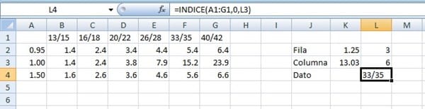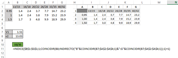 Y por ultimo, habiendo obtenido este dato, 15,2 necesito que el valor que me devuelva la formula sea el de la columna en el que se encuentra y correspondiente a la fila 1, que sería 33/35.