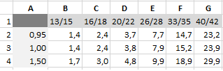 Por un lado tengo una primera variable obtenida de un cálculo y que debo comparar con los datos de la columna A, por ejemplo, si obtengo 1,25, el dato que coincide en la tabla, columna A, corresponde al igual o inmediatamente inferior, por lo que sería el 1,00. Esto, con BUSCARV esta resuelto.