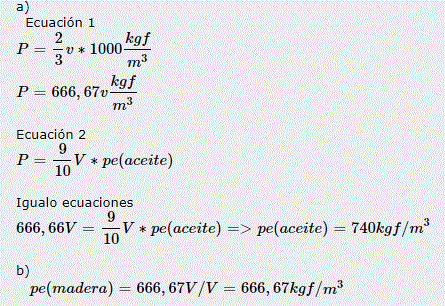 Un bloque macizo de madera flota en el agua pura, de manera que se encuentran sumergidas 2/3 partes de su volumen. Luego el mismo bloque se coloca en aceite y flota con 9/10 de su volumen sumergido. Cual es el peso específico de la madera y el peso específico de la madera