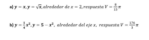 2. Calcula el volumen del sólido al girar la región limitada por las curvas dadas alrededor del eje especificado y puedes comprobar mediante Geogebra: