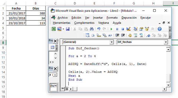 Tengo una columna, la columna F con distintas fechas, entonces en la columna J yo quiero que aparezca cuantos días hay de diferencia entre una fecha y otra, lo he intentado con el siguiente código pero no funciona, alguien podría decirme que esta mal o como podría hacerlo