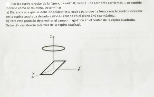 b) Siempre y cuando la corriente circulante por la espira circular ( no das ningún dato adicional al respecto) sea variable en el tiempo... la tensión inducida será d(flujo magnético)/dt... FEM inducida= corriente inducida x Z ... Ahora te quedaría todo así porque no estas dando detalles precisos sobre el tipo de corriente circulante por la espira circular inductora...