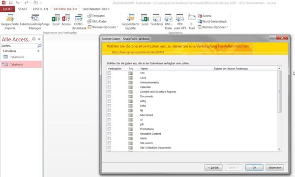 Cómo se puede cambiar una Tabla normal de Access a una que aparece en la lista de SharePoint para poder exportarla?