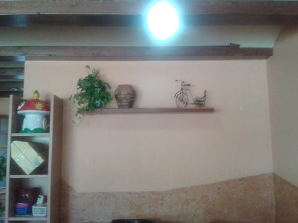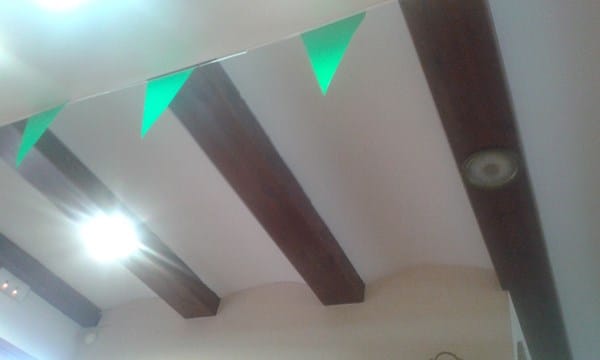 Perspectiva de la sala. Pared derecha, falso techo de bigas de madera y láminas de madera.
