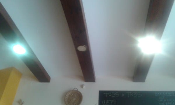 Empezaría por la más sencilla, aun a riesgo de que seguramente pueda ser la menos efectiva. A veces hay sorpresas en eso, pues interviene algo tan subjetivo como el "umbral de molestia auditiva". Sería largo de explicar y difícil de entender. Se trata de reducir la resonancia del local para reducir el efecto tambor. Tenemos en contra que creo que hay poca área sobre la que actuar (posiblemente solo los espacios entre las vigas). Este tipo de trabajo es el que se usa en cines. Necesitaría, para concretar, que me dijeses cuantos metros cuadrados ocupa esta superficie en comparación con los metros cuadrados del local. En las fotos esto no se ve. Sería estupendo que me hicieses un plano, aunque no sea muy perfecto, de este techo (como si lo estuvieses viendo tumbada en el suelo), en donde se aprecien las distintas superficies: los plafones donde están las luces empotradas, la zona de las vigas, etc. Si lo acompañas de algunas fotos (ya veo que se te da bien...), tanto mejor.