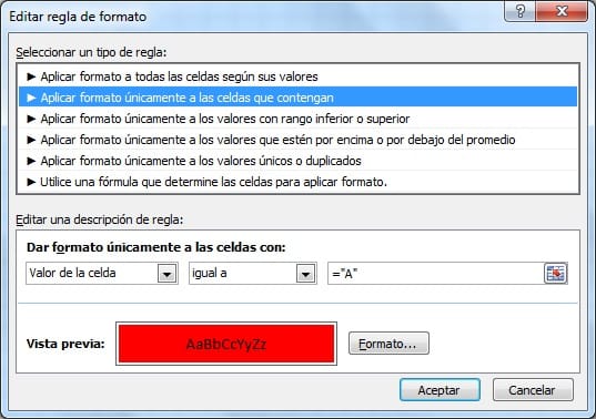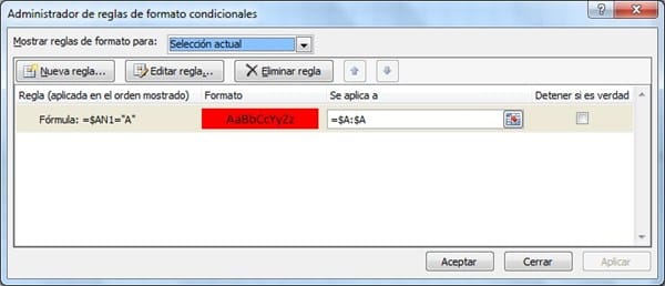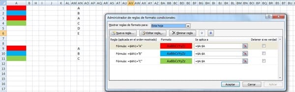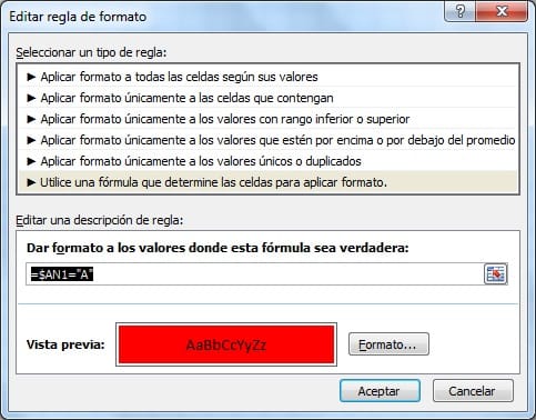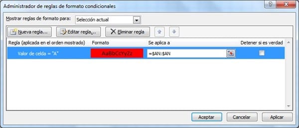 Me gustaría ver la forma de programar un formato condicional para generar color en una celda especifica, hasta el momento tengo en la columna "A" proyectos, y en la columna "AN", el tipo de proyecto, que se divide en 3 (A, B y C), mi idea es decirle a Excel, que si el tipo es A, me pinte la celda A del respectivo proyecto, por ejemplo