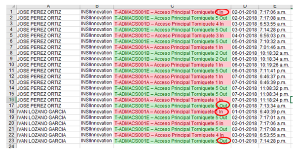 2.- Las filas 1C y 2C son dos repetidos debería rellenar el color amarillo ya que sea (IN) u (OUT)