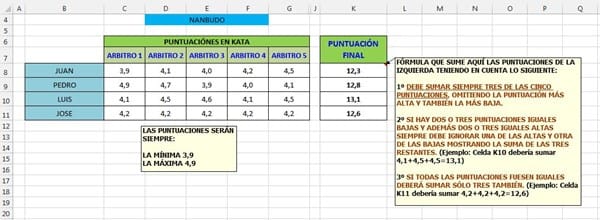 Fórmula Excel que sume 3 de 5 puntuaciones.