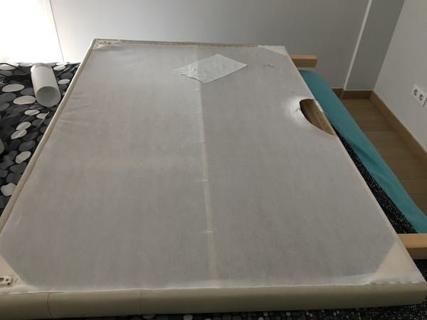 Y este es el cabecero, yo creo que al tener esa tela y al estar pegado en la pared es lo que ha hecho que no transpire. Probaré quitando la tela, que quedará más hueco entre la madera y la pared.