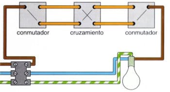 Diagrama con dos luces y tres conmutadores con tres enchufes.