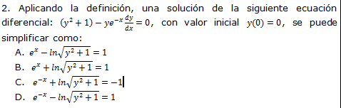 Aplicando la definición, una solución de la siguiente ecuación diferencial: (y^2+1)-ye^(-x) dy/dx=0, con valor inicial y(0)=0,