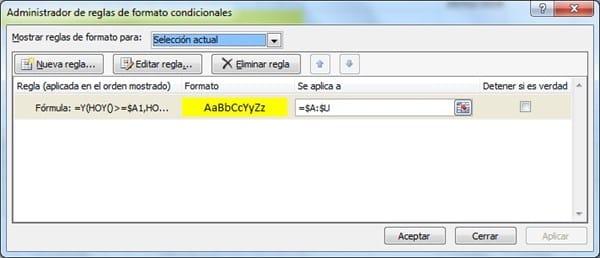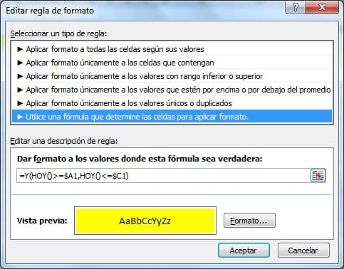 En la columna A y C tengo fechas correlativas y van por semanas. En la columna A van los lunes correlativos y en la columna C van los domingos.. Me gustaría que si la fecha de hoy esta comprendida entre la fecha de la celda A1 y C1 por ejemplo, que se resalte la fila A1:U1.