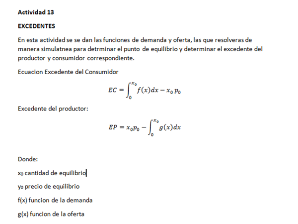 En esta actividad se dan las funciones de demanda y oferta, las que resolveras de manera simultanea para determinar el punto de equilibrio y determinar el excedente del productor y consumidor correspondiente