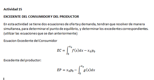En esta actividad se tiene dos ecuaciones de oferta y demanda, tendrán que resolver de manera simultanea, para determinar el punto de equilibrio, y determinar los excedentes correspondientes. (Utilizar las ecuaciones que se dan anteriormente)