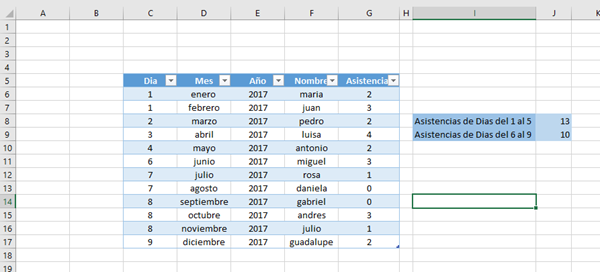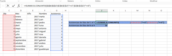 Basándonos en la imagen, necesito una pequeña fórmula que a partir de los días 1,2,3,4 y 5, de la columna ''C'' me sume las asistencias de la columna ''G'' en este caso son 13 y lo mismo para los días 6 al 9.