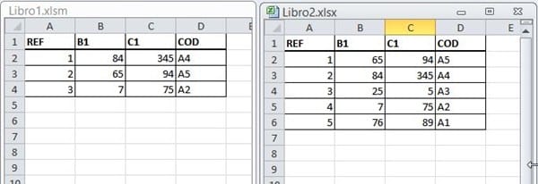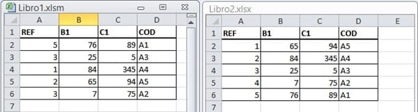 Lo que necesito es comparar la columna de COD en los dos archivos y el código del libro2 que no este en el libro 1 por ejemplo A1, de esa fila seleccione desde B hasta D y los pegue en el libro1 en la primera fila debajo de los títulos (B2).