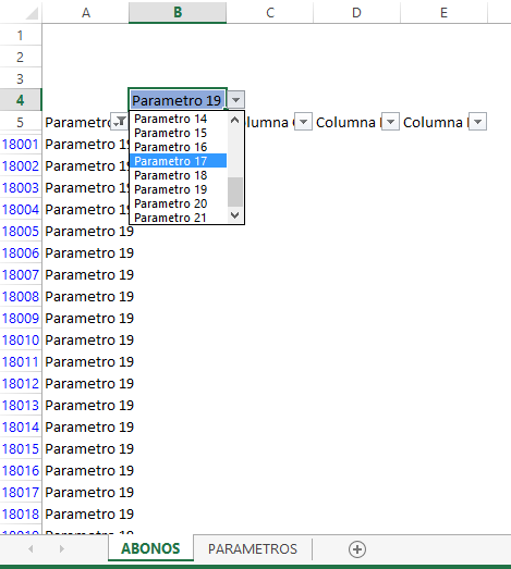 Lo que requiero es una macro que cuando en mi lista desplegable ABONOS! B4 se muestre un valor esta la compare con la lista de la hoja PARAMETROS! D6:D26 y si al comparar detecta que corresponde a un valor del rango muestre solo las filas correspondientes a cada valor,