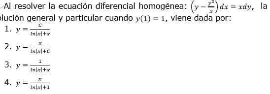 Al resolver la ecuación diferencial homogénea: (y-y2/x)dx, la solución general y particular cuando ?(1) = 1, viene dada por: