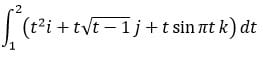 $$\begin{align}&\int_1^2t^2i= \frac{t^3}3 \Bigg|_1^2i=( \frac 8 3- \frac 1 3)i= \frac 7 3 i\\&\\&\int_1^2t \sqrt {t-1}\ j \ dt=\\&\\&t-1=u\ ==>t=u+1\\&dt=du\\&t=1 ==>u=0\\&t=2==> u=1\\&\\&= \int_0^1(u+1) u^\frac 1 2du \ j= \int_0^1 u^\frac 3 2 + u^\frac 12 )du\ j=\\&\\&\frac{u^\frac 5 2}{\frac 5 2} + \frac{u^\frac 3 2}{\frac 3 2}\Bigg|_0^1j=( \frac 2 5+ \frac 2 3)j=\frac{16}{15}j\\&\\&\\&\int_1^2 t \sin \pi t dt \ k=\\&\\&t=u==>u'=1\\&\sin \pi t =v'==> v= \frac{-\cos \pi t}{\pi}\\&\\&=\frac{-tcos \pi t}{\pi}+ \frac 1 \pi \int \cos \pi t=\\&\\&\frac{-tcos \pi t}{\pi} + \frac 1 {\pi^2} \sin \pi t \Bigg |_1^2 k=\\&\\&- \frac 2 \pi +0 - (- \frac {-1}\pi+0)=- \frac 3 \pi k\\&\\&\end{align}$$