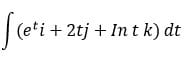 $$\begin{align}&\int(e^t i + 2t j + ln t \ k)dt=\\&\\&e^t\ i+ t^2 j+(tlnt\ -t)k\end{align}$$