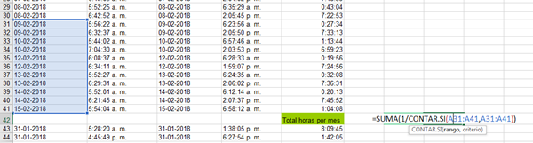 ini = 2 fin = Range("B" & Rows.Count).End(xlUp).Row For i = ini To fin + 1 If Cells(i, "B") = "" Then Cells(i, "G") = "Total día" Cells(i, "G").Interior.ColorIndex = 43 Cells(i, "H").FormulaR1C1 = "=SUM(1/COUNTIF(R" & ini & "C[-1]:R" & i - 1 & "C[-1],R" & ini & "C[-1]:R" & i - 1 & "C[-1]))" ini = i + 1 End If Next