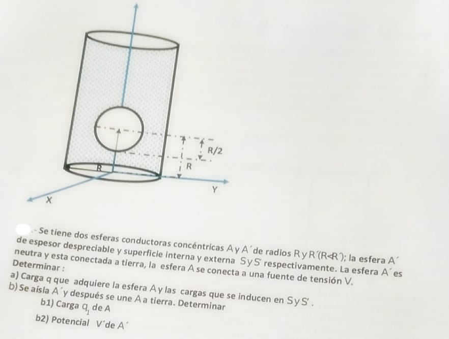 Se tiene dos esferas conductoras concéntricas A y A' de radios R y R' (R<R') ; la esfera A' de espesor despreciable y superficie interna y externa S y S' respectivamente . La esfera A' es neutra y está conectada a tierra, la esfera A se conecta a una fuente de tension V.