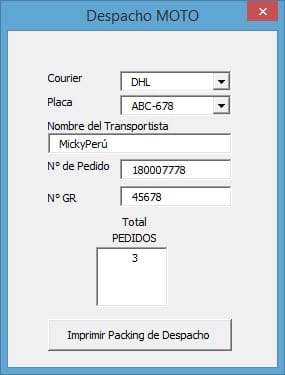Finalmente, en "Total pedidos" (TextBox2) poner un contador, de acuerdo a la cantidad de pedidos ingresados. Ese dato es solo visual y debe de borrarse al presionar "Imprimir packing de Despacho" (CommandButton3).