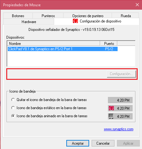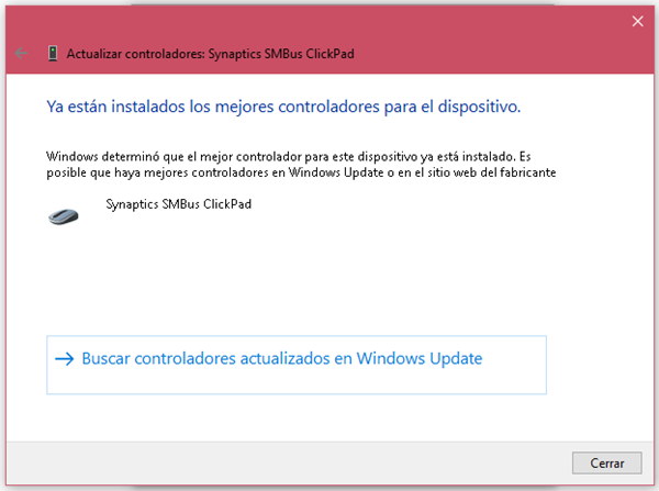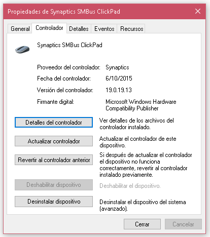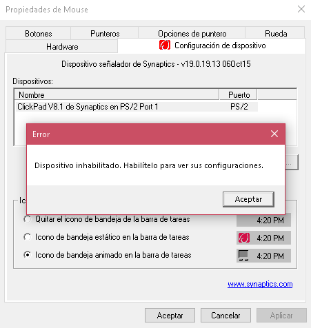 En la sección resaltada con un rectángulo rojo debería aparecerme una opción de "Habilitar". De todas formas seguí intentando, y tras presionar dos veces el dispositivo llamado "ClickPad V8.1 de Synaptics en PS/2 Port 1" me sale el siguiente error: