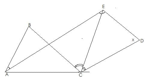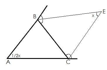 - En un triángulo ABC, la medida del ángulo formado por las bisectrices exteriores de los ángulos C y C es igual al doble de la medida del ángulo A. Hallar la medida del ángulo A.