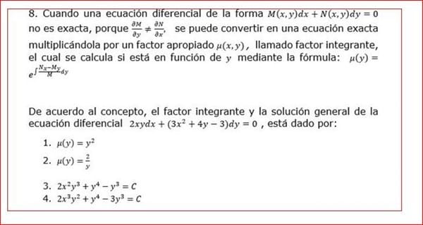 $$\begin{align}&2xydx+(3x^2+4y-3)dy=0\\&Mdx+Ndy=0\\&\\&M_y=2x\\&N_x=6x\\&{M_y} \neq N_x\\&\text{No es diferencial exacta}\\&factor \ Integrante:\\&\\&\mu(y)=e^{\int \frac{N_x-M_y}{M}dy}=e^{\int \frac{6x-2x}{2xy}dy}=e^{\int \frac{4x}{2xy}dy}=e^{\int \frac 2 y dy}=e^{2ln|y|}=e^{lny^2}=y^2\\&\\&\text{Luego la opción(1)}\\&\\&\text{Multiplicamos la Ecuación\\&Diferencial por el Factor Integrnte}\\&2xy^3dx+(3x^2y^2+4y^3-3y^2)dy=0\\&\\&\text{ComprovMOS que ahora si es diferencial exacta}\\&M_y=6xy^2\\&N_x=6xy^2\\&M_y=N_x\ \ si\\&\\&F(x,y)=\int M_ydx=\int 2x y^3 dx=x^2y^3+h(y)\\&\text{al integrar respecto , la constante de integración depende de y: h(y)}\\& \text{derivando lo anterior respecto de y, y lo igualamos a N}\\&\frac{\partial F}{\partial y}= N\\&3x^2y^2+h'(y)=3x^2y^2+4y^3-3y^2\\&==>\\&despejando\\&\\&h'(y)=4y^3-3y^2\\&integrando\\&h(y)= \int (4y^3-3y^2)dy=y^4-y^3\\&\\&Luego\ la \ solución:\\&F(x,y)=x^2y^3+y^4-y^3=C\end{align}$$Sería la opción (3) pero el primer término aparece multiplicado por 2. Lo he repasado varias veces y a mí ese 2 no me sale.
