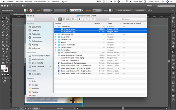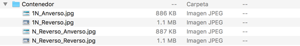 Al reproducir la acción para exportar la siguiente credencial, en nuestra carpeta "Contenedor" encontramos que hubo un cambio en el nombre de los archivos exportados, ya que el nombre que le di en la acción es "N" el guión bajo lo pone automáticamente para escribir el nombre de las mesas de trabajo "Anverso" y "Reverso"