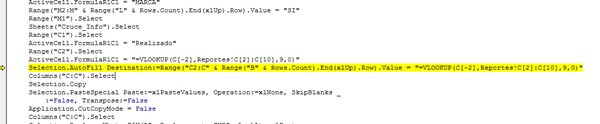Selection.AutoFill Destination:=Range("C2:C" & Range("B" & Rows.Count).End(xlUp).Row).Value = "=VLOOKUP(C[-2],Reportes!C[2]:C[10],9,0)"
