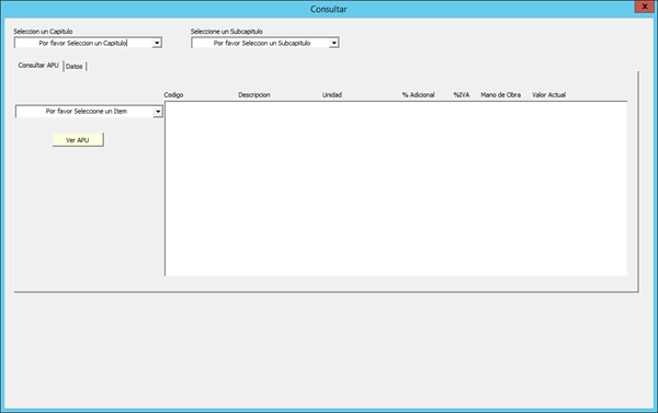 En ese formulario el usuario primero debe seleccionar un capitulo, luego un subcapitulo y por ultimo un ítem, en cuanto selecciona el ítem automáticamente se le traen al Listbox la información de "Código" "Descripción" y "Unidad", si el quiere ver el resto de datos debe darle click al botón "Ver APU", y en ese momento el programa debe ir a la siguiente base de datos y traer los datos que voy a señalar
