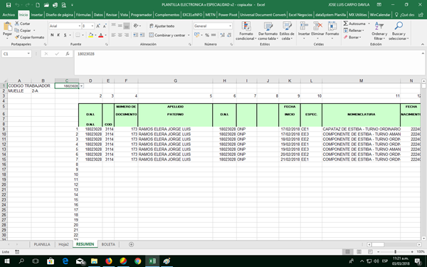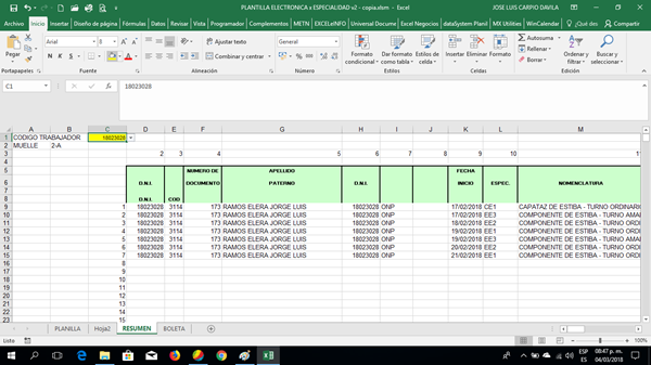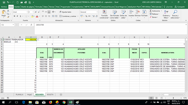 En la Hoja RESUMEN, mediante una lista desplegable en la celda C1, se lograr filtra los DNI como valores únicos y lo que se prende es que el valor de la celda C1 vayan variando de 1 en 1, para que en la hoja boleta se imprima trabajador por trabajador hasta el ultimo registro (DNI) de esa lista desplegable,