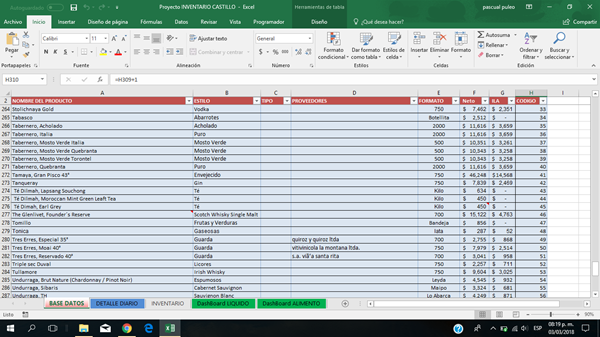 La hoja "BASE DATOS" es donde tengo el listado de productos desde la celda "a2" y va creciendo en una tabla ya insertada insertada y en la columna "h2" los codigos igual en unsa tabla insertada.