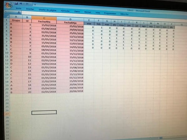 Tengo una tabla con los datos que aparecen en la imagen adjunta coloreada: Grupo, Id, FechaAlta y FechaBaja.