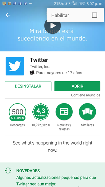 Luego fuia la app de Twitter (aparece el pajarito) y me dijo que Actualizar y luego Abrir, y arriba de Abrir, a la derecha, nuevamente los tres puntitos. Pero al darle click aparece Habilitar, como lo verás en la imagen.