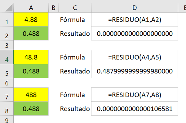 Quiero hacer un "Formato Condicional" o "Validación de Datos" con la fórmula "=RESIDUO()", pero me doy cuenta al aplicar la fórmula que arroja decimales cuando la división es exacta. ¿Por qué sucede esto?