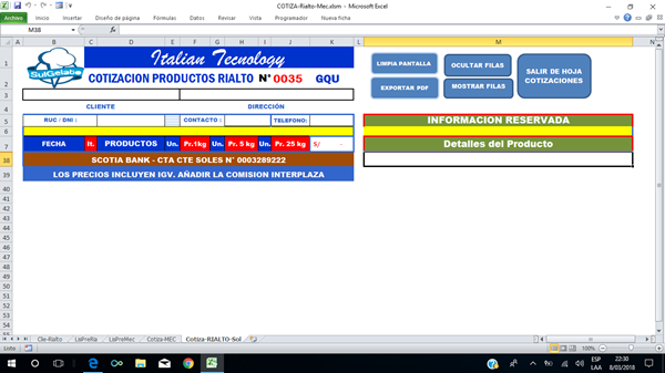 Estimado Abraham, el primer código esta más cerca, aunque solo falta hacer que respete las filas que están con productos que se supone se están cotizando, los otros códigos, a mi no me funcionan, y estoy seguro es por mi falta de conocimiento, ya que si bien es cierto he trabajado con hojas de calculo y en cierto momentos con códigos, muy simples. Como quiera que me he jubilado, y todos sebemos que si al cerebro no lo ejercitas, como todo, pierde eficacia. Y una hija me pidió que le haga una hoja o mejor dicho plantila para hacer sus cotizaciones, y eso estoy trantado de hacer. Muchas gracias por tu paciencia y ayuda para entender mejor este lenguaje que me parece muy interesante. Muchas gracias. Orlando Dávila
