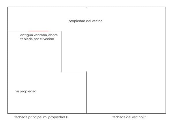 Entiendo que la fachada de la casa delimita el espacio horizontal de ésta: me encuentro con que la casa colindante (C) tiene dos habitación dentro de dichos límites, una de ellas hasta nos ha tapiado una ventana que antiguamente daba al exterior en la fachada posterior (ver imagen adjunta).