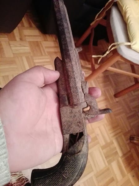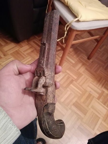 Tengo esta arma de doble cañón aun funciona el gatillo, pero debido a la oxidación no se ningún nombre o fecha o si es de imitación