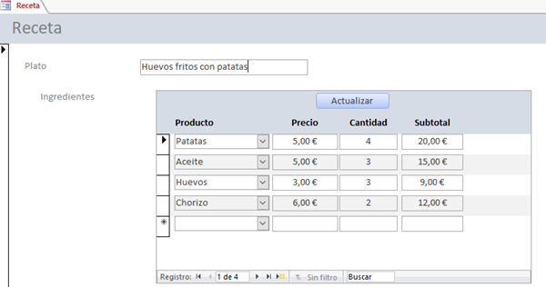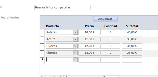 Tengo una base de recetas, en el formulario principal selecciono mediante cuadro combinado la receta cuyos ingredientes se muetran en un subformulario, el cual tiene 4 campos. Ingrediente, cantidad, unidad, costo, costounitario (a este lo traigo desde la tabla con precios actualizados). El calculo ya lo hice. Pero lo que no le encuentro la vuelta es que al seleccionar la receta y cargue los datos en suformolario me realice nuevamente el calculo de "costo" entre costounitario y cantidad, según la condición puesta en "unidades" (kg, grs, uds, ml). Tengo una tabla donde actualizo el valor del costounitario, por eso al ver la receta debe recalcular el "costo".