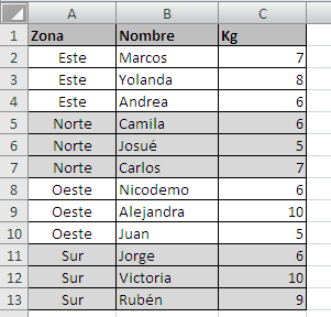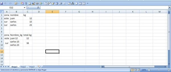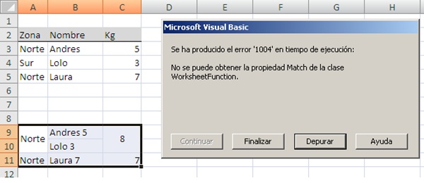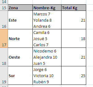 Y quiero una macro para conseguir este resultado, concatenando en una celda el nombre y los KG y colocar en otra el total de Kg.