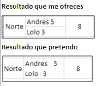 Tu macro crea una celda combinada para Norte (y así para cada resultado) y y luego concatena el nombre y los pesos colocándolos en celdas diferentes, yo pretendo que estén en la misma celda. Con el peso lo mismo. Adjunto imagen