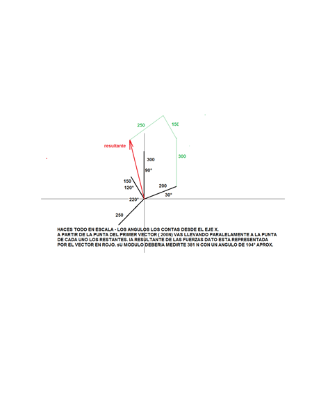 así como el ángulo formado respecto al eje X positivo, los ángulos de las fuerzas están medidos respecto al eje X positivo. F1= 200N a 30°; F2= 300N a 90°; F3= 150N a 120°; F4= 250N a 220°.
