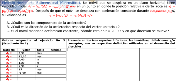 Un móvil que se desplaza en un plano horizontal tiene velocidad inicial 〖 v ⃗〗_i = (v_ix i ̂ + v_(iy ) j ̂) m/s en un punto en donde la posición relativa a cierta roca es 〖 r ⃗〗_i = (r_ix i ̂ + r_iy j ̂) m. Después de que móvil se desplaza con aceleración constante durante t_1 s, su velocidad es 〖 v ⃗〗_f = (v_fx i ̂ + v_fy j ̂) m/s.