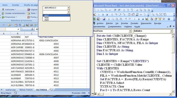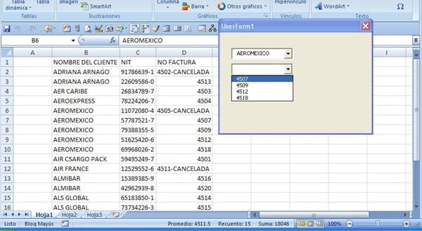 Este es un ejemplo de como lo hace la macro, en la pantalla puedes ver cuantas canceladas tiene Aeromexico y como no se cargan en el combobox2 al seleccionar el cliente.