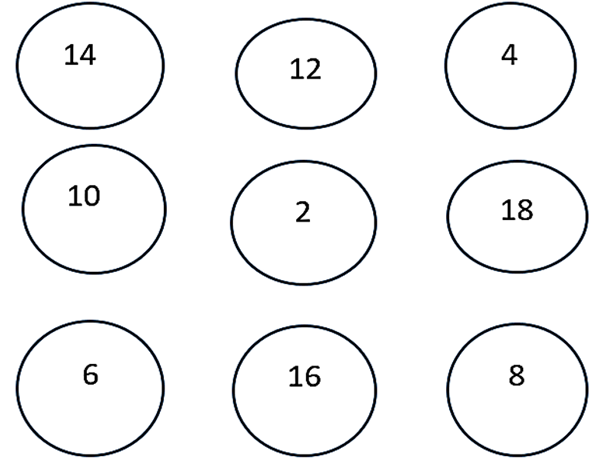Tu no puedes mover las fichas 6,2 y 14 cuantas fichas como mínimo debes mover para que la suma en cada columna, fila y diagonal sean iguales.